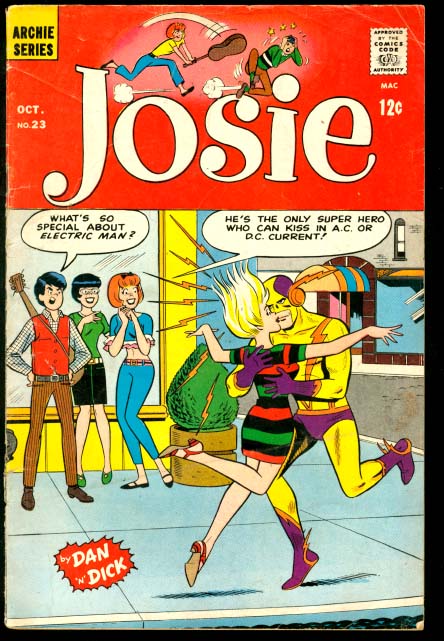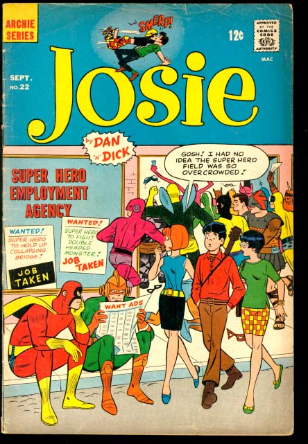 I'm pretty sure that is the be all and end all of Archie's smattering superhero-gags on the cover of Josie. "He's the only superhero who can kiss in A/C or D/C current" is a most peculiar gag. The other cover can be recylced with any glut of superhero titles in any era of comic book history.